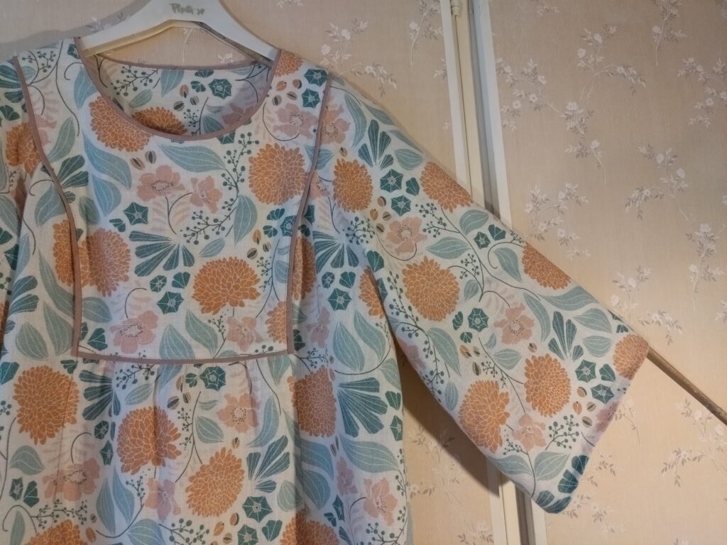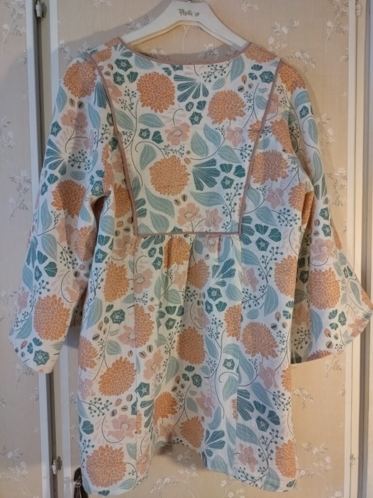 Mönstret är från en gammal Simplicity-tidning och mycket modifierat. Att korta av från en klänning till en tunika är ju inte så komplicerat. Men eftersom jag inte är så lång kortade jag dessutom av besparingen. Sprundet i halsen tog jag bort. Ärmarna var väl vida och djupt ringade så det tog jag också in. Besparingarna fram och bak är i dubbelt tyg och fastsydda så att det inte är några traskanter på insidan.