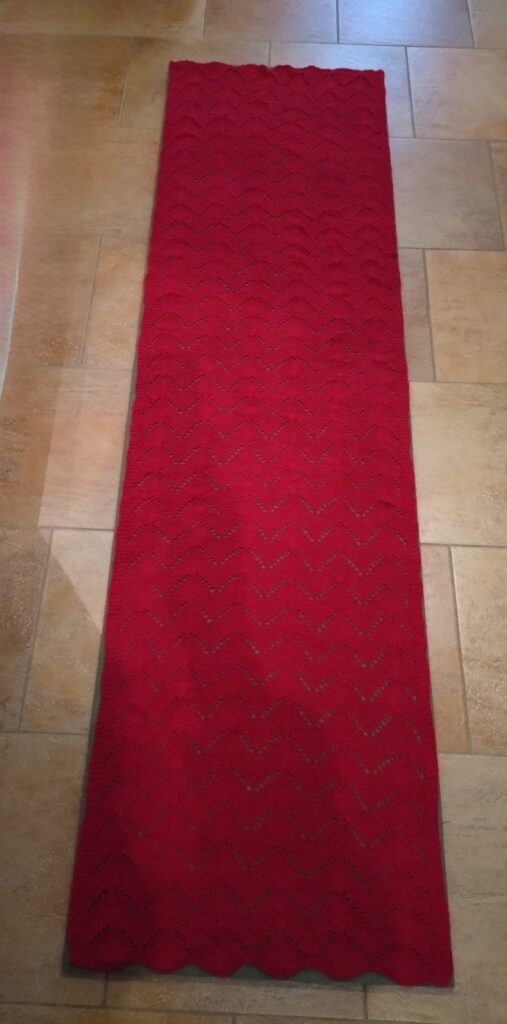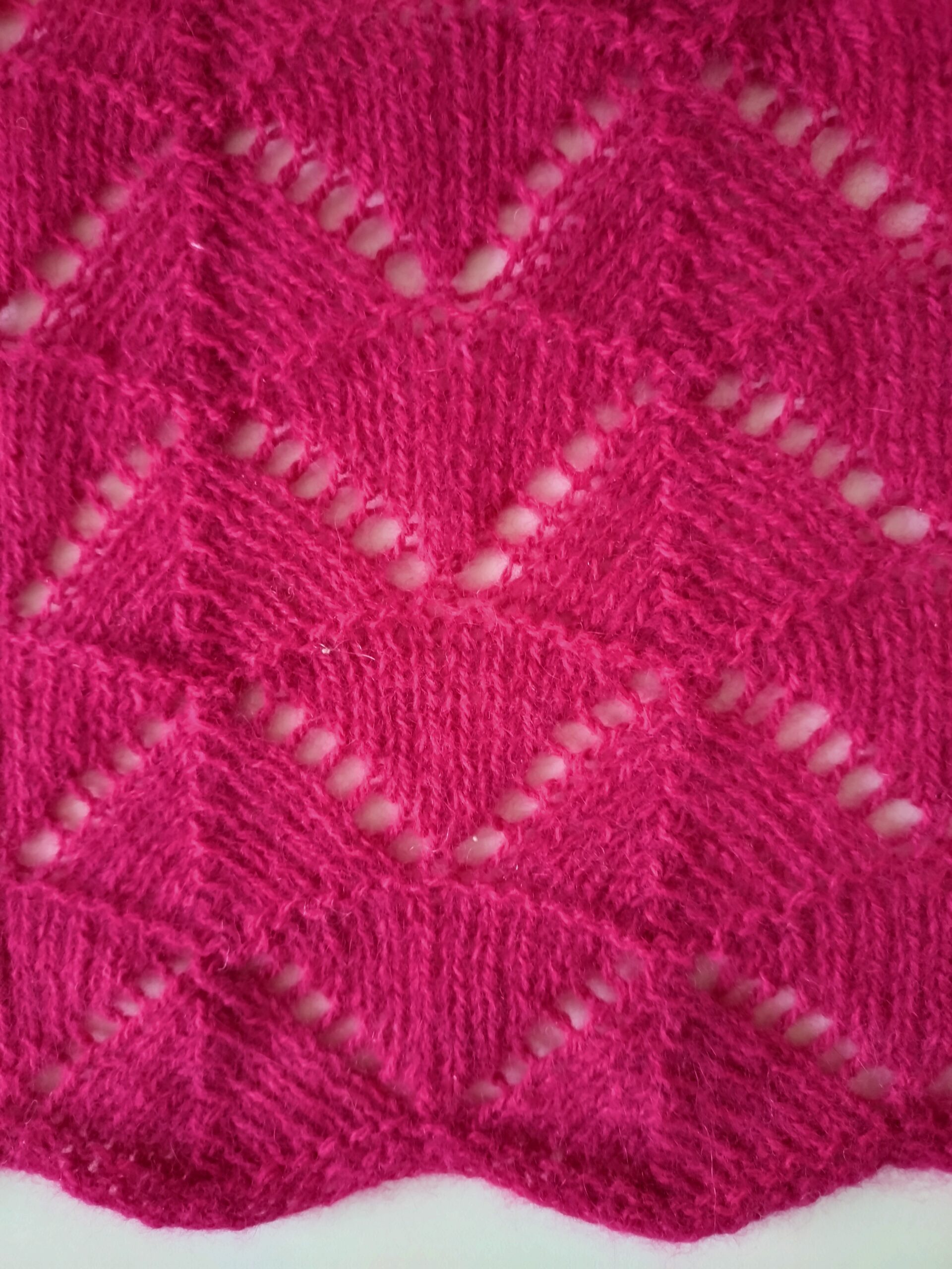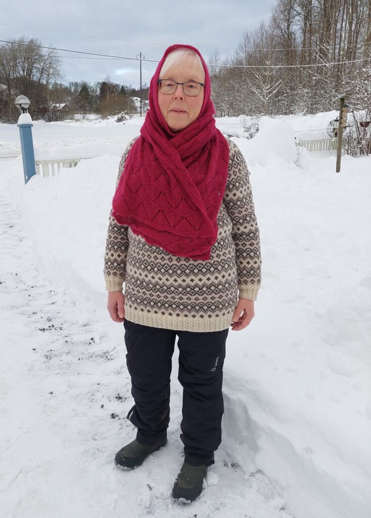 En spetsstickad sjal i tunt garn stickad med grova stickor, mycket lätt. Garnet köpte jag på Syfestivalen (den gamla modellen) för säkert över 25 år sedan. För något år sedan tog jag äntligen tag i att göra något av garnet. Det blev enligt mönstret som medföljde garnet, fast jag skippade fransar.